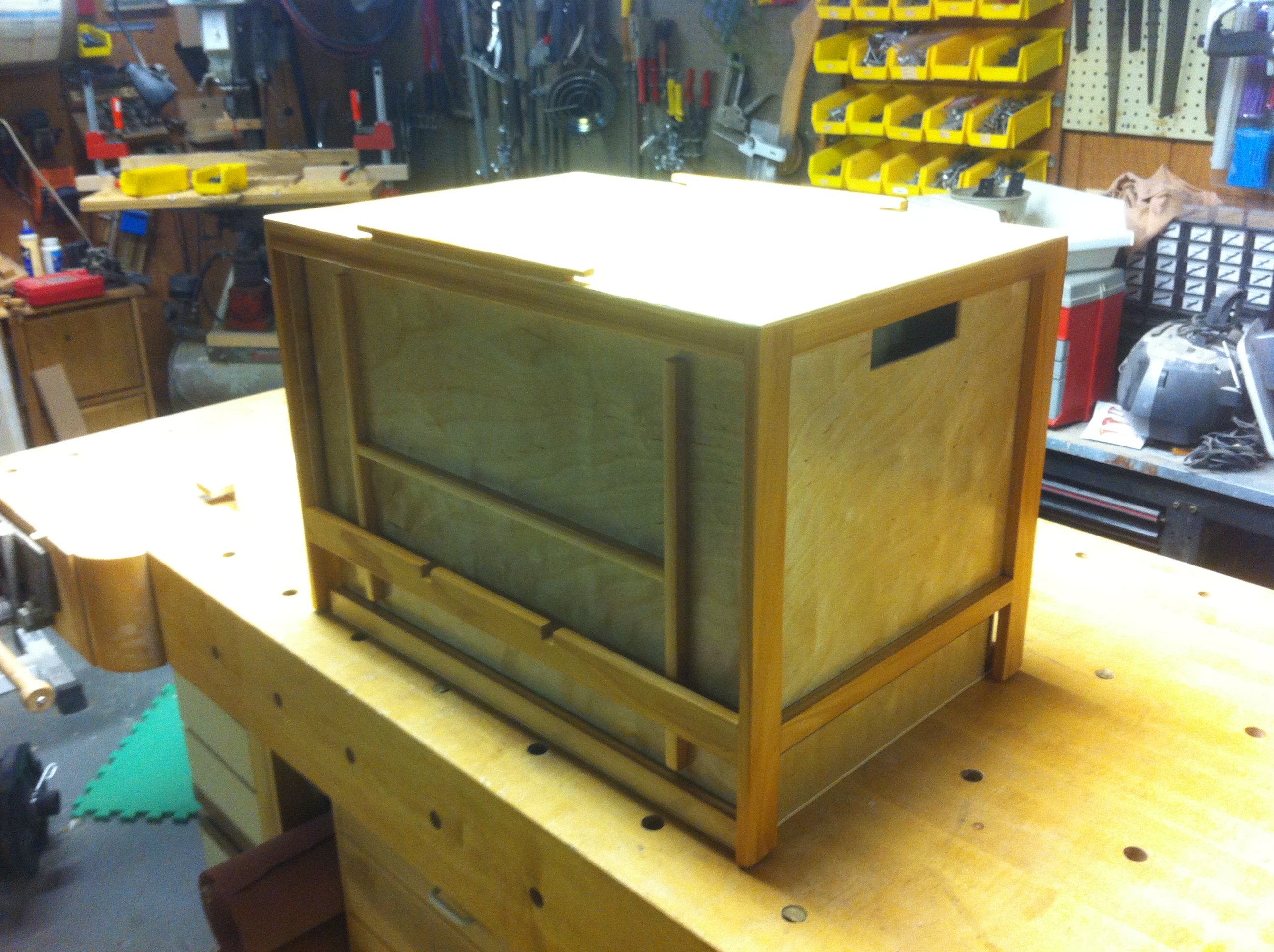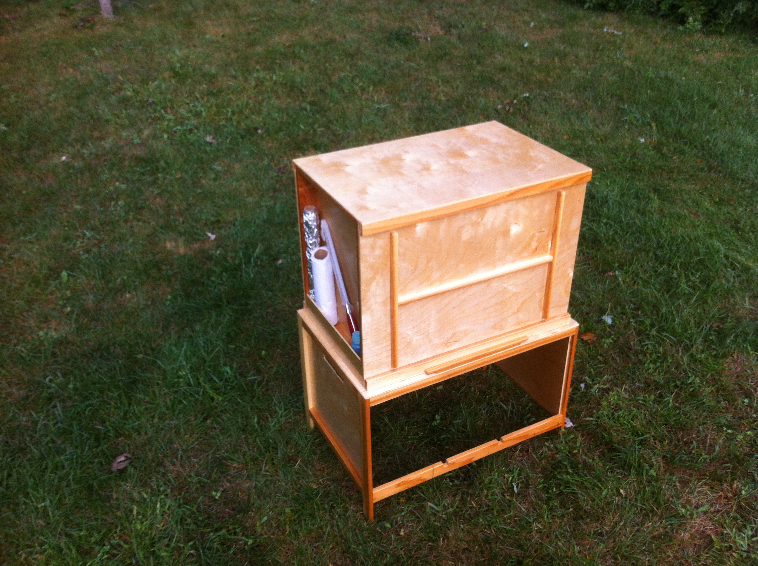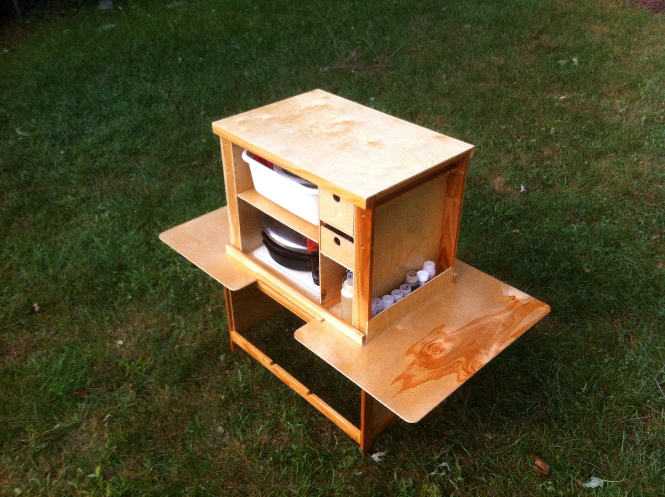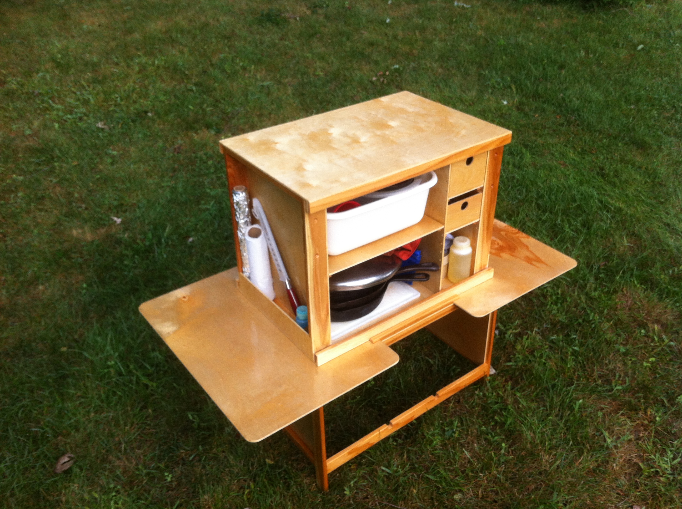 [UPDATE 9/4/2014] We used the box for almost a month straight and it was awesome. It has a number of scratches from being hauled in and out of the van many times a day. Still, it held up well and was it ever fantastic to have all the kitchen stuff easily accessible. After leaving the box setup in a monsoon rain which filled the spice racks with water I decided to drill a weep hole in each corner of the side cubbies to allow it to drain should that happen again.