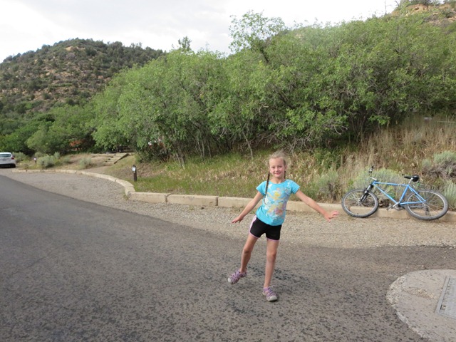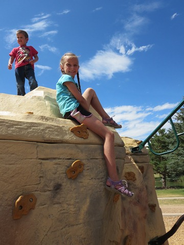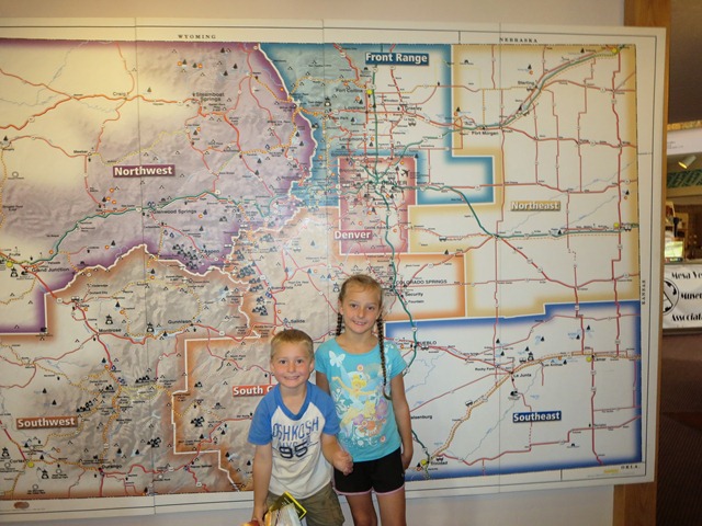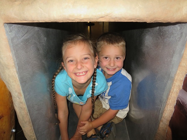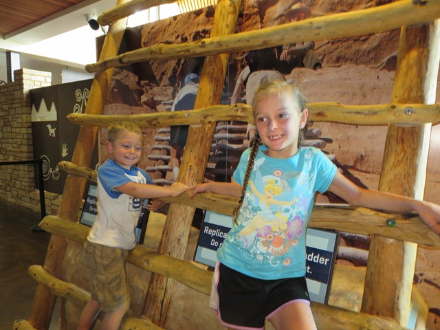 The large map behind the kids was of Colorado. We were at a Colorado Visitor’s Center in Cortez which was all the way in the lower left hand corner of the map. They gave us great information on tours in Mesa Verde and we loved the free wi-fi. The picture of the kids on the ladder and in the tunnel was at the Mesa Verde Visitor’s Center. They had them out because you had to be able to climb a thirty-two foot ladder and go through a twelve foot tunnel to be able to go on the Balcony House tour. We also picked up Junior Ranger books while we there.