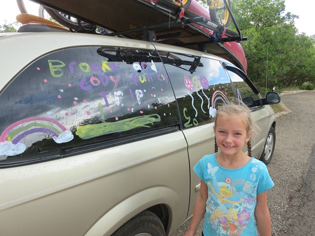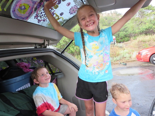 Scott cooked up our first Outback Oven pizza for this trip. I was SO excited. His pizzas are incredible. It was a great idea until the afternoon monsoon rain came. Scott had to finish cooking and clean all the dishes in the rain. We ate the pizza in the shelter of the van. We also had to set up the tent in the rain for the first time on this trip. Thankfully the rains weren’t too heavy while we set up the tent. The picture of Brooke next to the tent was her being afraid that the rain was going to wash the van art off. At this rate it appears as though we may need some heavy duty scrubbing to remove the artwork. Brooke and Cody are thrilled! :-) Since the rain started out light we all stayed out. Brooke even danced in the rain a bit.