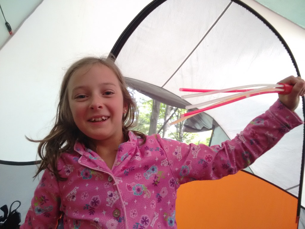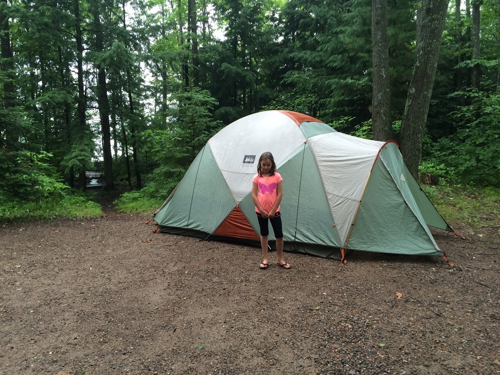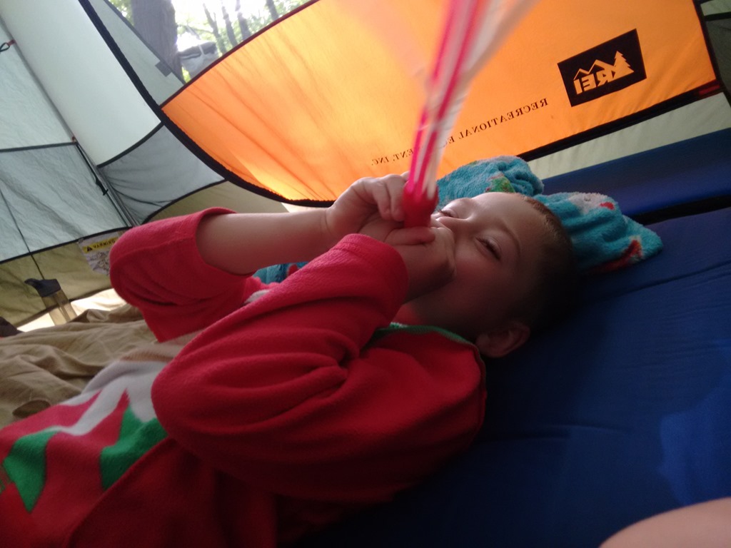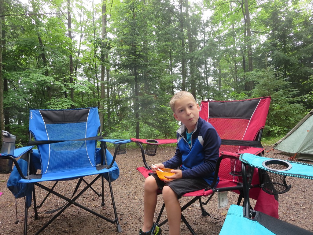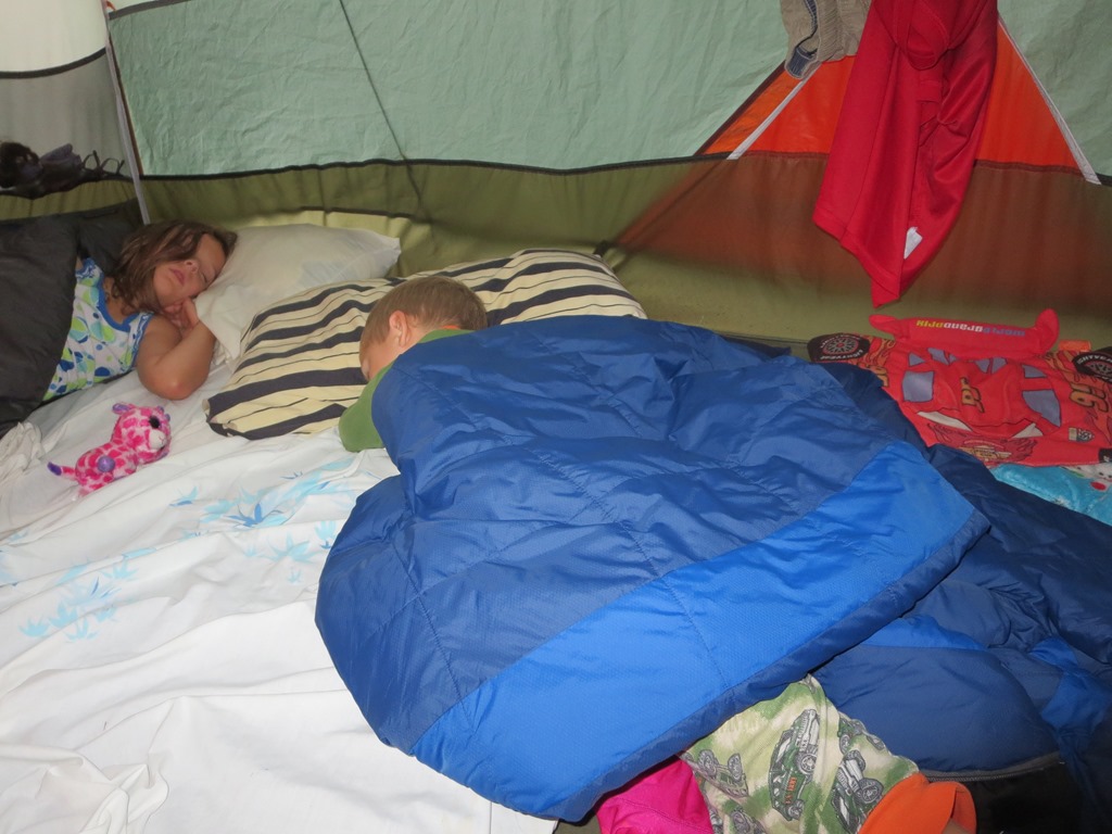 The kids have no idea who the Three Stooges are, but sleeping in between the two rollers and trying to dodge their random super swift limb extensions made me feel like I was reenacting the Three Stooges. Being wide awake turned out to be a blessing because the heat lightning started looking more like a fourth of July fireworks finale and the wind began to pick up. Then the wind sounded suspiciously like approaching rain. Cody karate kicked Scott and I took the opportunity to ask him if he heard the rain. No sooner had Scott sleepily finished saying it was just wind then drops began to fall into the tent. I have put the fly on in the dark quite a few times and Scott many more times than I, but it has been a while and we fumbled in our sleepy state trying to find the right direction. Last night I asked before I retreated from the mosquito swarm into the tent if we needed the fly. Scott said not worry as the forecast showed only a 5am sprinkle. The 5am sprinkle not only came early, but down poured into four and a half hours. The storm meant water was going to seep into the tent, but on the upside the sticky humidity was replaced with a cool cleansing summer storm. Listening to summer storms in the tent is one of my favorite parts about camping.