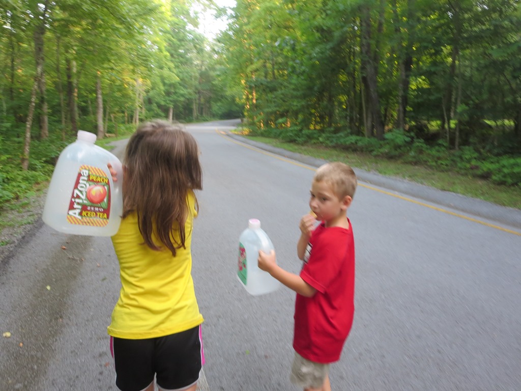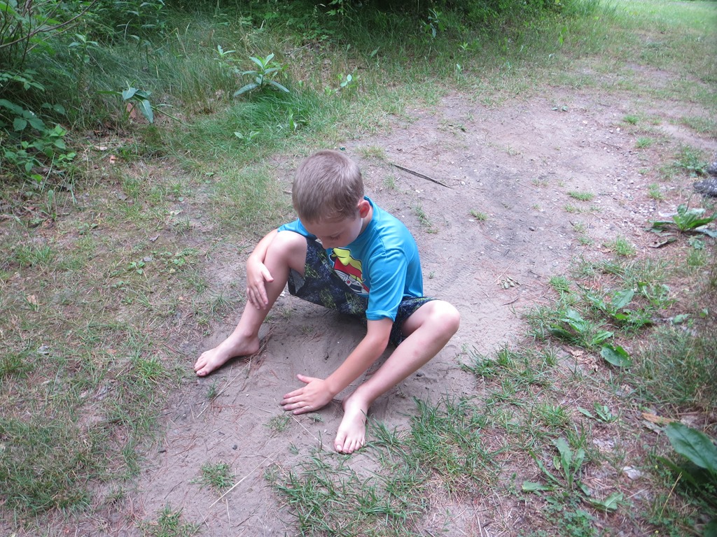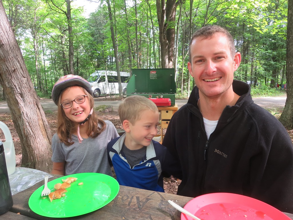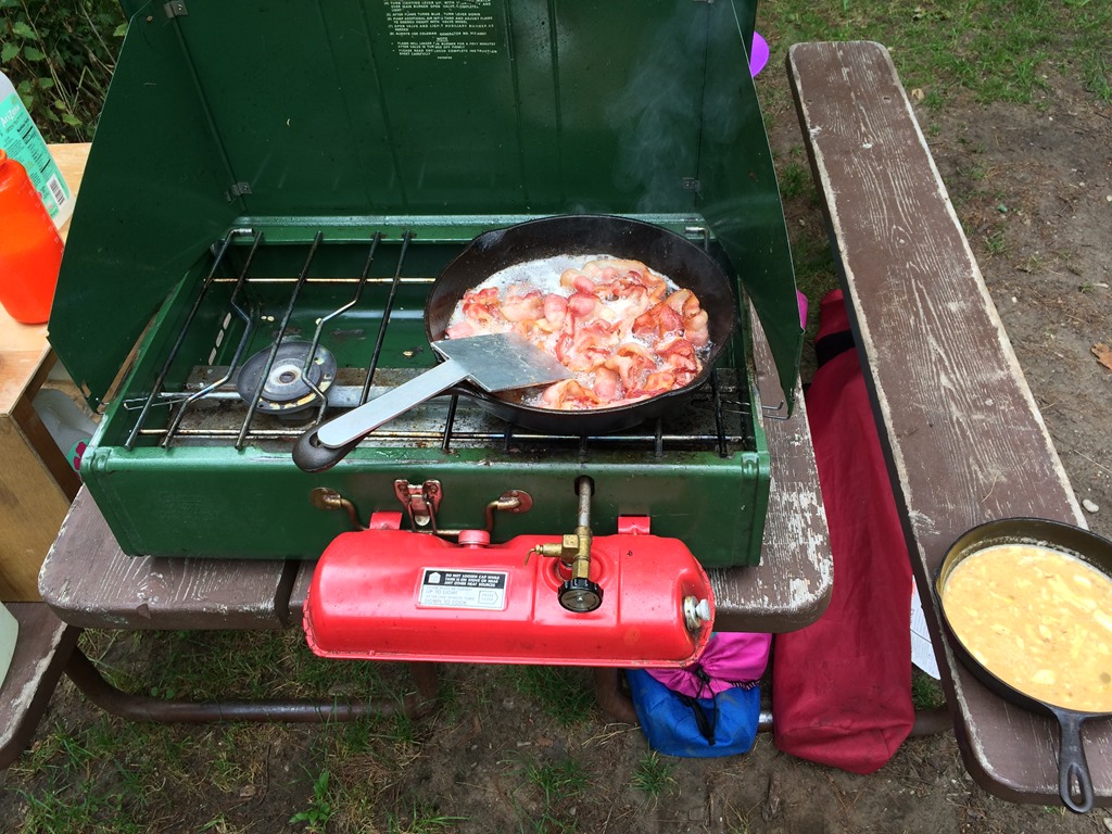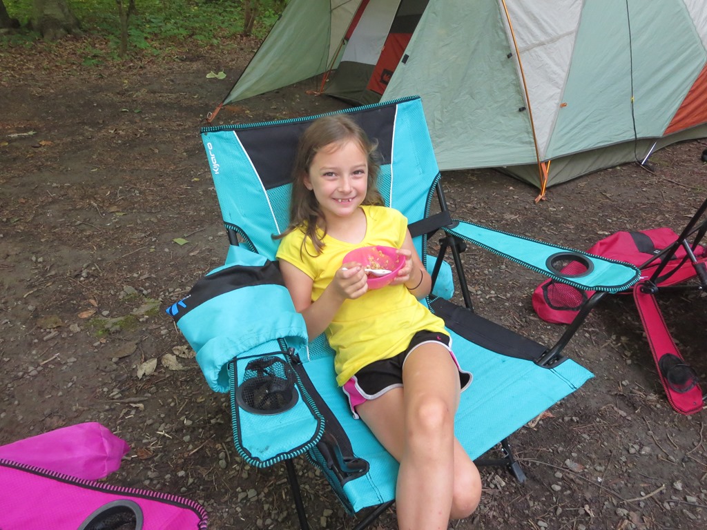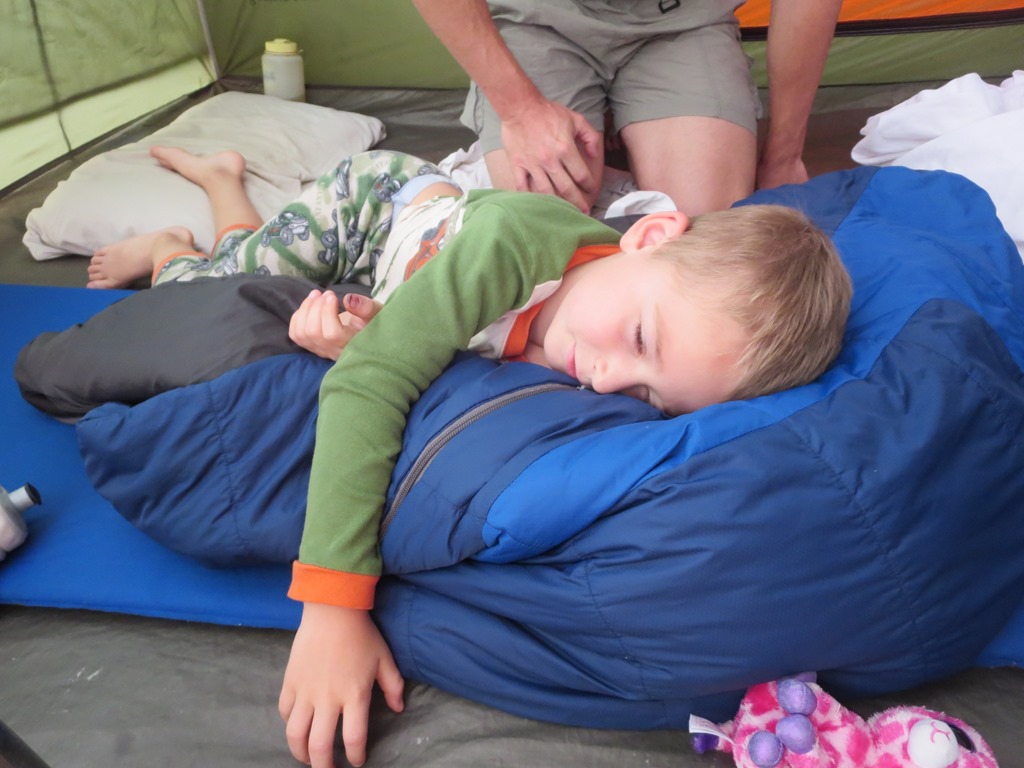 The kids have no idea who the Three Stooges are, but sleeping in between the two rollers and trying to dodge their random super swift limb extensions made me feel like I was reenacting the Three Stooges. Being wide awake turned out to be a blessing because the heat lightning started looking more like a fourth of July fireworks finale and the wind began to pick up. Then the wind sounded suspiciously like approaching rain. Cody karate kicked Scott and I took the opportunity to ask him if he heard the rain. No sooner had Scott sleepily finished saying it was just wind then drops began to fall into the tent. I have put the fly on in the dark quite a few times and Scott many more times than I, but it has been a while and we fumbled in our sleepy state trying to find the right direction. Last night I asked before I retreated from the mosquito swarm into the tent if we needed the fly. Scott said not worry as the forecast showed only a 5am sprinkle. The 5am sprinkle not only came early, but down poured into four and a half hours. The storm meant water was going to seep into the tent, but on the upside the sticky humidity was replaced with a cool cleansing summer storm. Listening to summer storms in the tent is one of my favorite parts about camping.