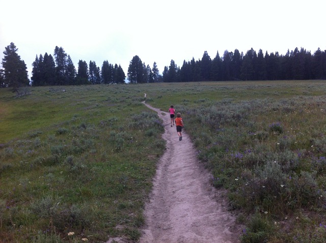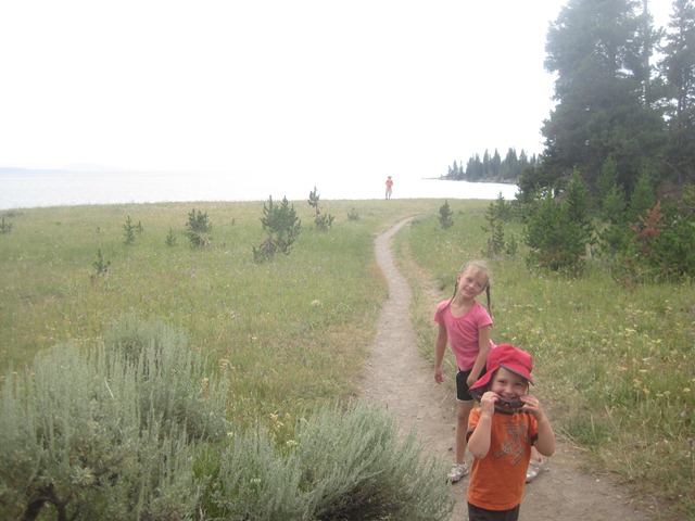 We don’t know how long the Indian Pond Trail in Yellowstone was, but we are pretty sure it was our longest hike thus far on this trip (We later found out that it is called the Storm Point trail and is about 2 miles long). Cody was super tough on this hike. We started this hike at 3:45 and ended by 5. He didn’t cry at all or even ask to get picked up. Cody and Brooke ran the first ten minutes of this hike. I couldn’t believe they still had any energy left for the rest of the hike. Indian Pond is not just a normal pond. It is more evidence of geothermal activity. The sign stated that the ancient geyser had experienced “hydrothermal blowout.” Instead of releasing steam gradually the ground water flashed to steam so violently that it blasted out hundreds of feet of overlying rock that still lines the pond.